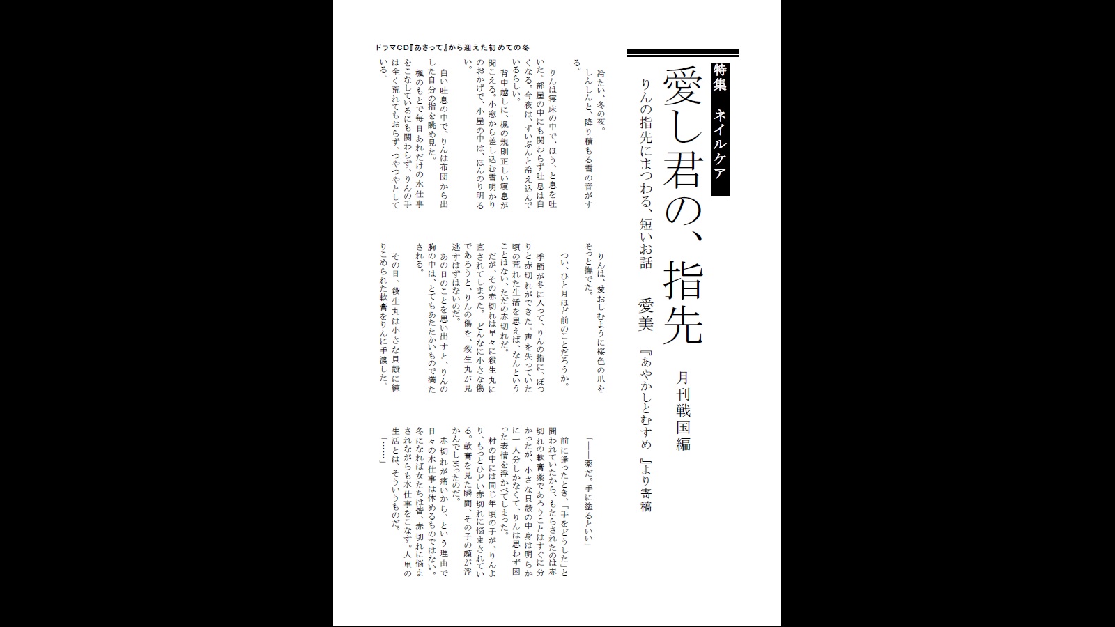 C87(2014.12.29)に頒布された『月刊SENGOKU』に載せていただいた、短編を。 原稿とほぼ同じです。時子さまの素敵イラストのおかげで生まれた作品です。 この本は完売しておりまして、再販の予定もないとのことで、こちらにUPさせていただきました。